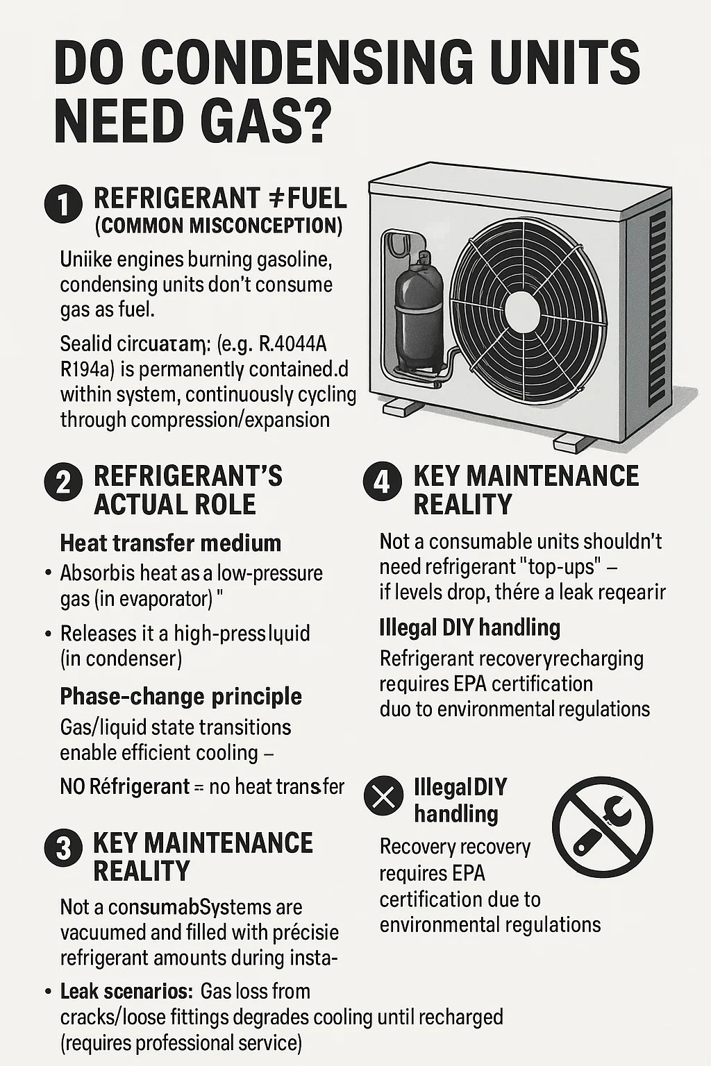 Níl, aonaid chomhdhlúthaithe Ní gá dóibh féin "gás a bheith ag teastáil" - ach éilíonn a gciorcad cuisniúcháin go hiomlán go bhfeidhmeoidh gás cuisneáin. Seo an miondealú criticiúil: