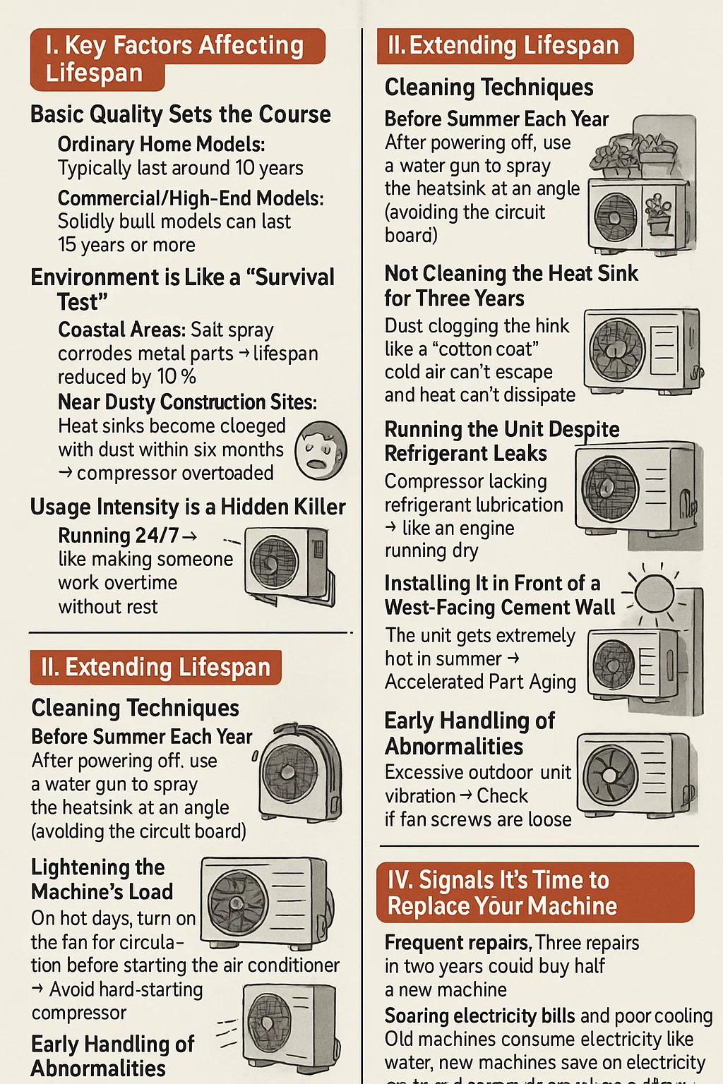 Cosúil le fearais tí eile, tá saolré an comhdhlúthadán oiriúntóir aer nach bhfuil socraithe, ach cinneann nósanna úsáide laethúil agus cothabháil cé chomh fada agus is féidir é a mhaireann. Seo iad na príomhphointí: